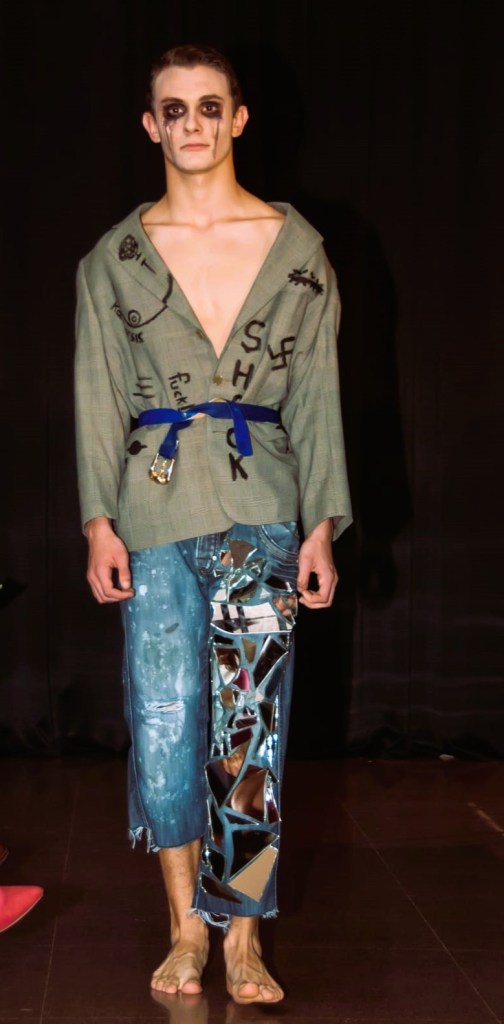 Deconstructed sartorial jacket on upcycling material