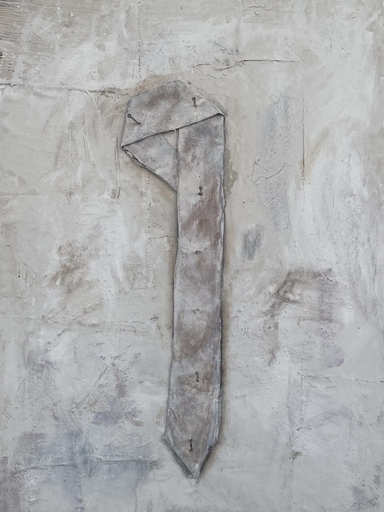 Texil, leather and nails in mixed media on stretcher bar 100x70cm.